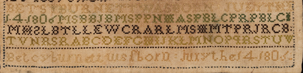 Similar to other Shaker samplers is the sampler’s plain, unadorned format reflecting the simplicity and practical nature of Shaker life. Betsy’s sampler does however show errors that are less commonly seen in the other Shaker samplers documented on AKS, (lack of proper spacing in the signature lines, misspelling of her first name in the lower signature line, and occasional inverted letters). Her use of “f” rather than “s” in “was” in the lower signature line reflects an older English language variant.