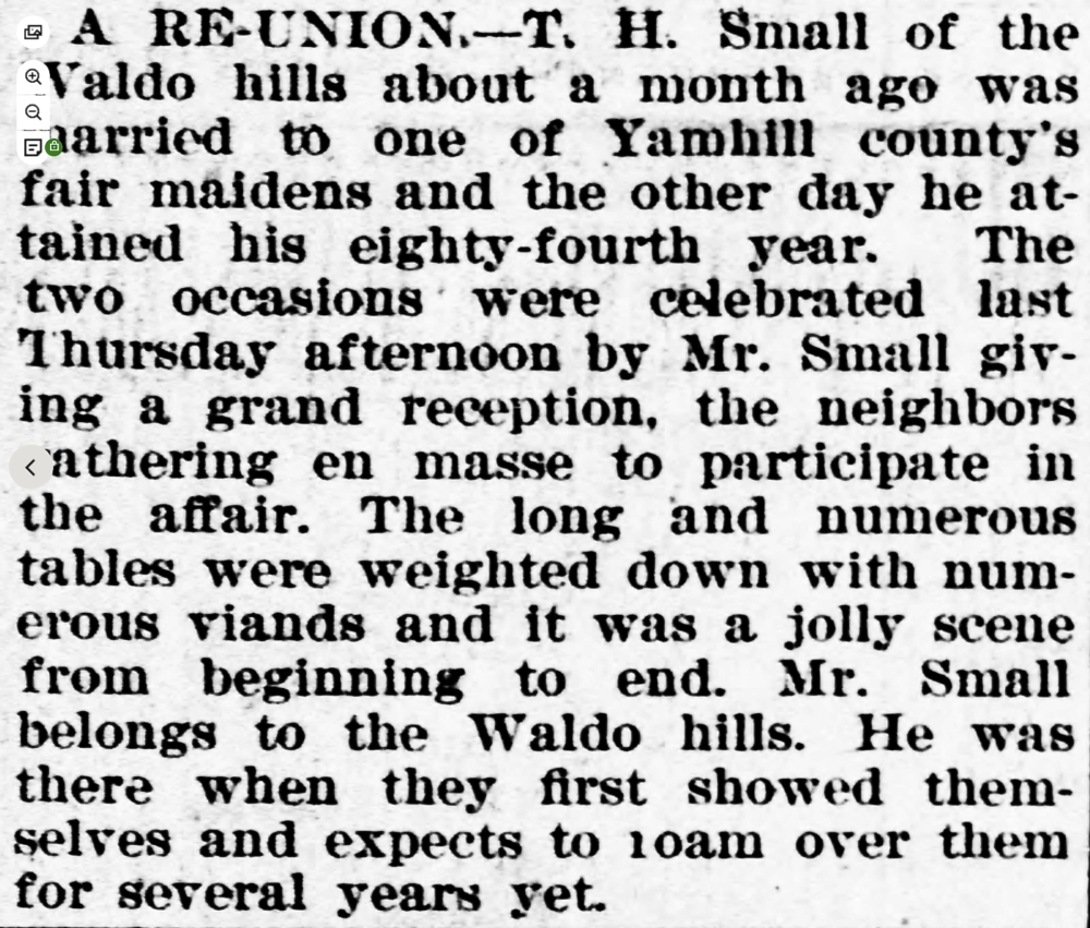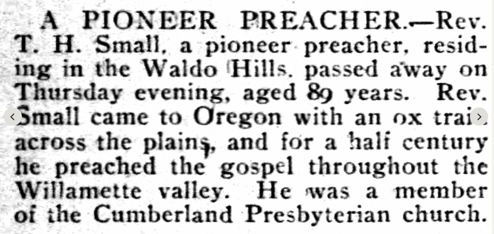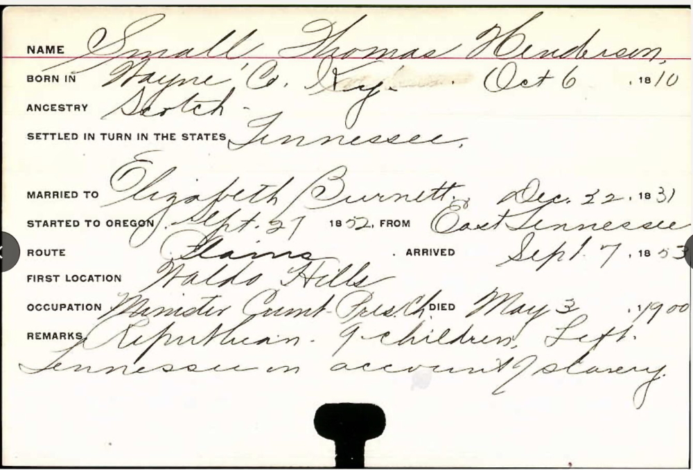In the ancillary images there is a labeled “ID Card” for both Betsy and Thomas in the Oregon Pioneer Index stating that Thomas Henderson Small and his wife Elizabeth Burnett had (at some point) moved to Sweetwater, Monroe County, in eastern Tennessee. Subsequently, on September 27, 1852, they removed from Tennessee (“on account of slavery”), via the “Plains Route” (an eastern segment of the Oregon Trail), to Oregon. On September 7, 1853, after a one-year journey, they arrived in Waldo Hills, Oregon, (on the east side of the Willamette Valley), where they became ensconced in the community. Thomas’s “ID Card” noted that they were Republican and had nine children.