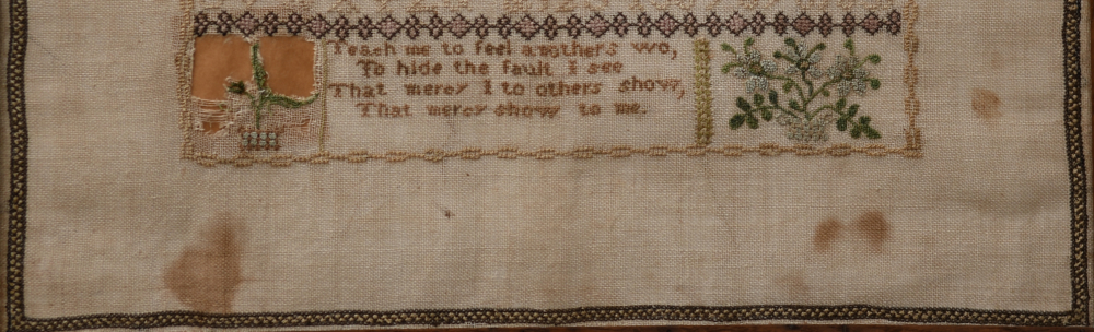 Below this is a somewhat centrally located verse flanked by potted flowers/plants with significant loss to the plant on the left. The 10th verse of Alexander Pope’s poem, The Universal Prayer, reads: