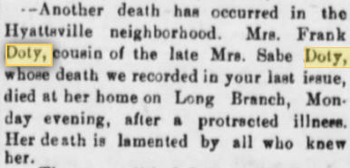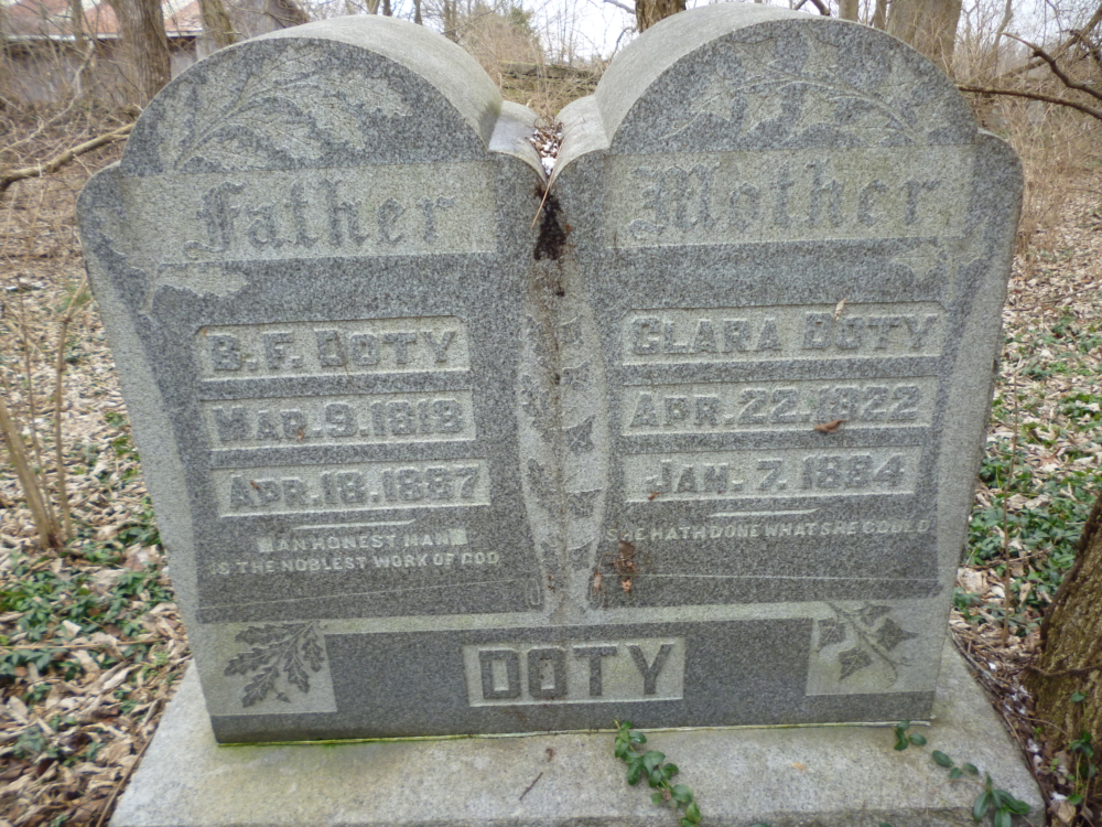 Clarissa “Clara” Arnold died on January 7, 1884 and is buried in the John Doty Graveyard in Lancaster, Garrard County, Kentucky next to her husband, Benjamin Franklin Doty. Her headstone is intriguingly engraved, “SHE HATH DONE WHAT SHE COULD” (see ancillary images).