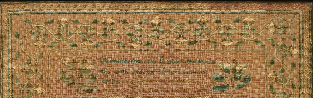 Concentric simple and decorative borders (including a Greek key border) surround the periphery of the sampler with an approximately two inch wide, continuous vine with leaves and flowers as the most central border . In the middle of the sampler there is a vase and flower flanked by short rows of alphabets to the left and right. Above the vase and flowers is the a verse (Ecclesiastes 12:1) flanked by sprigs of a flowering plant. The verse reads: