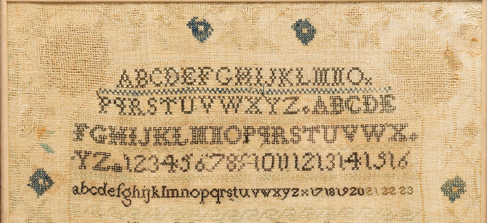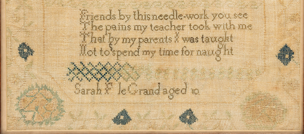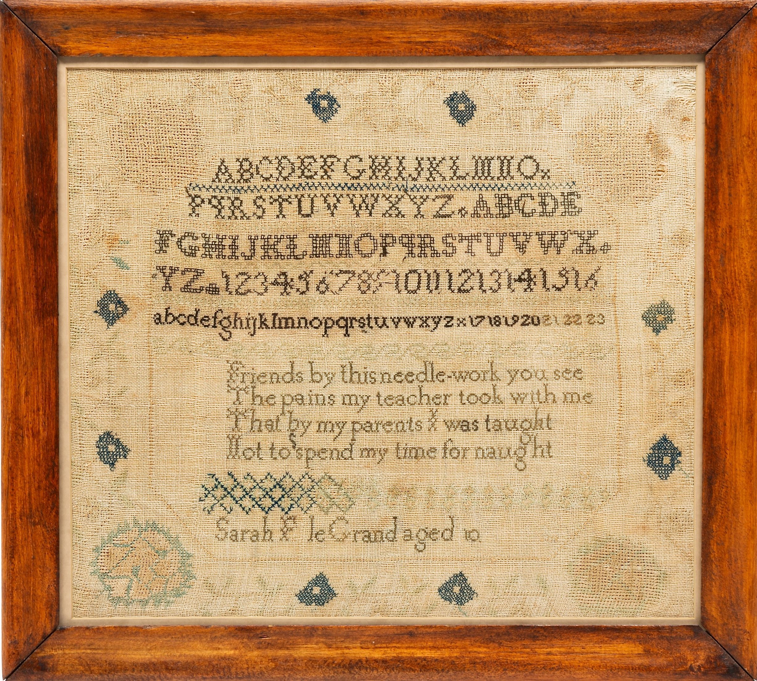 Sarah F LeGrand made the sampler ca 1838. The sampler was most recently in a private collection until it was won at the Amelia Jeffers, Winter Fabulous Finds Auction, January 31-February 2, 2025, (Lot 148) by AKS Private Collector #48.